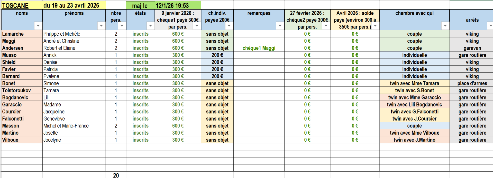 - Le solde : ajusté selon le nombre de participants, avant le 3 avril 2026